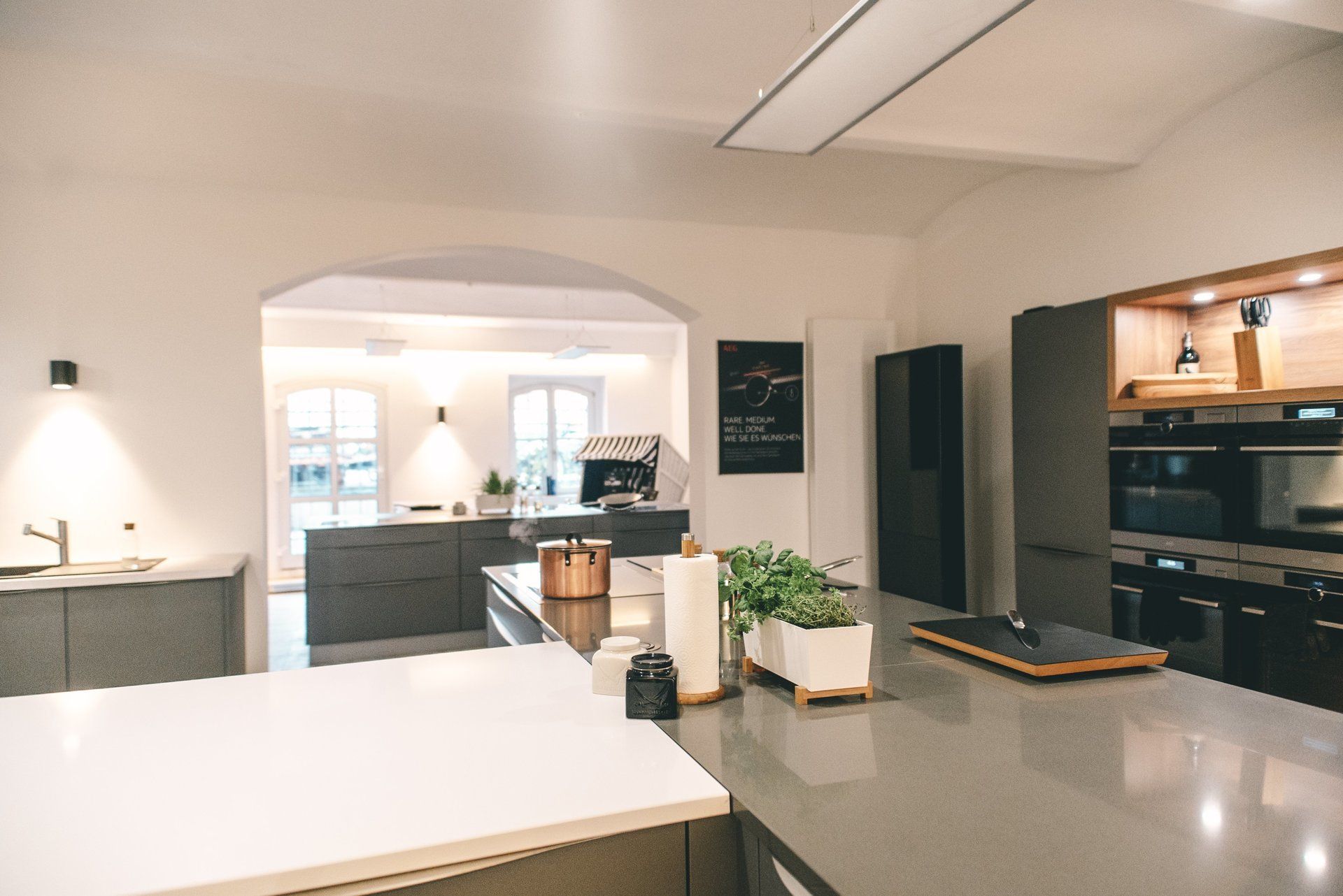 Die moderne stylische Küche bietet viel Platz und den geeigneten Rahmen, um Firmenveranstaltungen wie Präsentationen, Produktvorstellungen und Marketing-Aktionen durchzuführen.